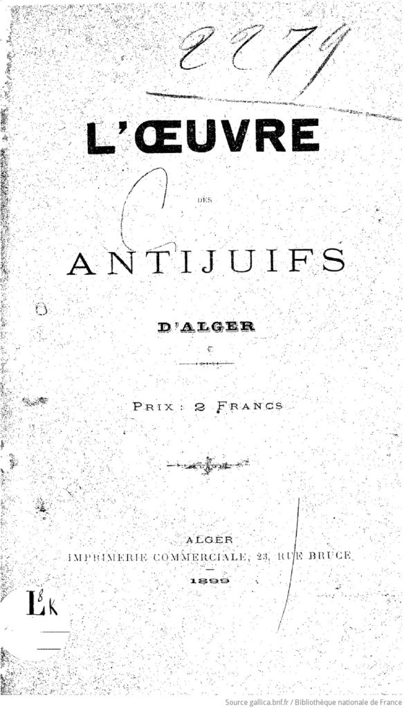 En 1899, à l’Imprimerie commerciale, à Alger, parut un volume de documents intitulé : L’œuvre des antijuifs d’Alger.